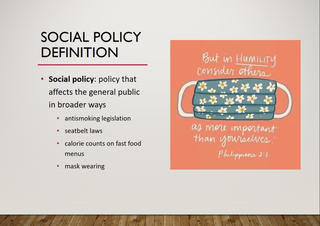 We have some discussion on the first three examples before we get to the last one, and last fall it helped people to see how to frame the issue differently. I chose the particular image with a mask and Bible verse because I happen to teach at a faith based institution and also talk about broader values that get embedded into policy, including religious values. (I spend a whole other session talking more specifically about how we see values embedded into social policies, particularly into social welfare policies, with a <if I say so myself> cool amalgamation of videos from them to see historical and current examples of this.)