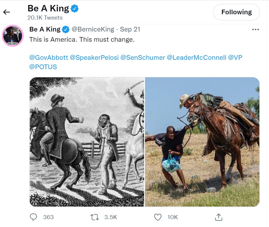 Earlier this week, when news broke about the Haitian immigrants at the border of Del Rio, I couldn’t comprehend it, just in terms of the sheer numbers of people. When I saw images of people being chased by DHS officials on horses, I couldn’t process it. Then I saw Bernice King’s tweet, pictured below, and I finally had to stop trying to cognitively run from it.